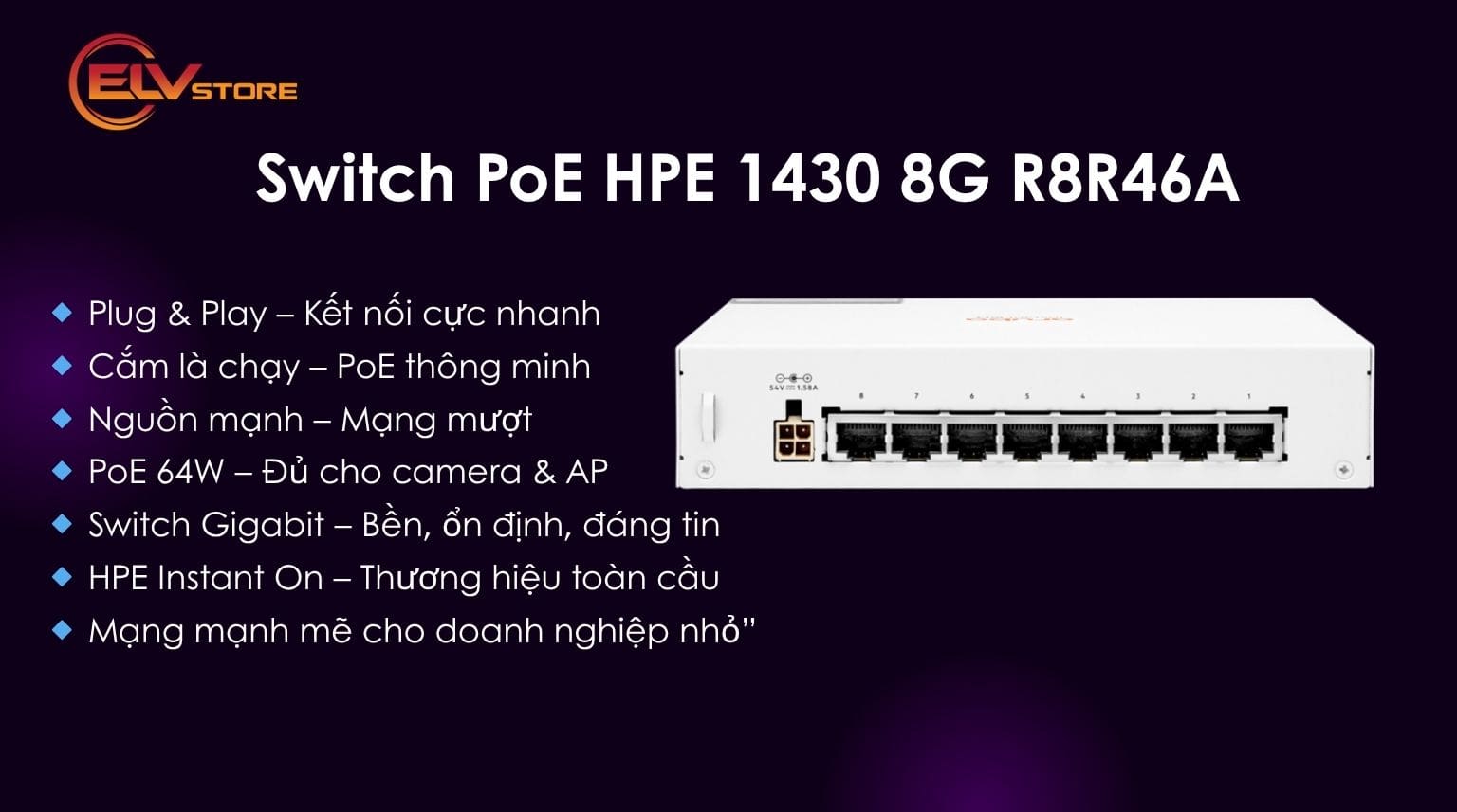 Trong phân khúc switch PoE 8 cổng dành cho doanh nghiệp nhỏ, quán café, shop thời trang hay văn phòng gia đình, HPE Networking Instant On 1430 8G PoE (R8R46A) là một trong những lựa chọn nổi bật. Vậy sản phẩm này thực sự có gì “đáng tiền” và khác biệt so với các đối thủ cùng tầm giá? Hãy cùng tìm hiểu chi tiết.
