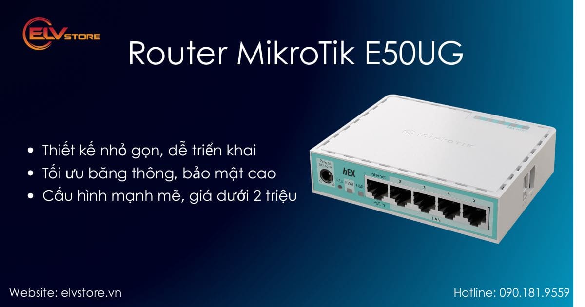 Website: https://elvstore.vn/san-pham/networking-security/routers/router-mikrotik-e50ug-up-to-60-120-user