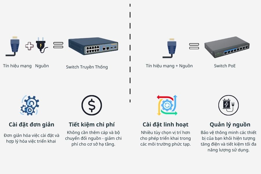 Nếu thiết bị có PoE, switch sẽ cấp điện. Nếu thiết bị không hỗ trợ PoE, switch chỉ truyền dữ liệu và không cấp nguồn.